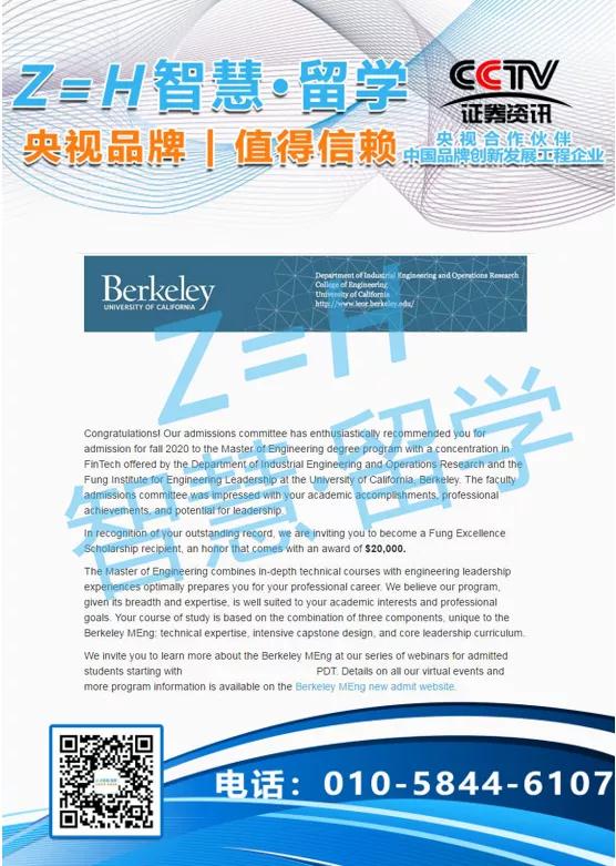 高端美国留学中介智慧留学—美国留学录取20000美金奖学金和世界排名第4美国加州大学伯克利分校