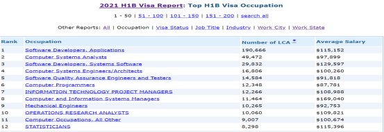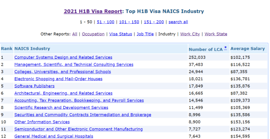 从整个行业类别来看,能够为国际生提供更多就业机会的计算机类相关行业依旧是美国留学生在美国就业的主要领域,一共提交了252,033个H1B申请。也就是说,同学们如果有计划在美国留学毕业后留在美国找工作,计算机类相关专业依旧是非常值得提早规划的行业。