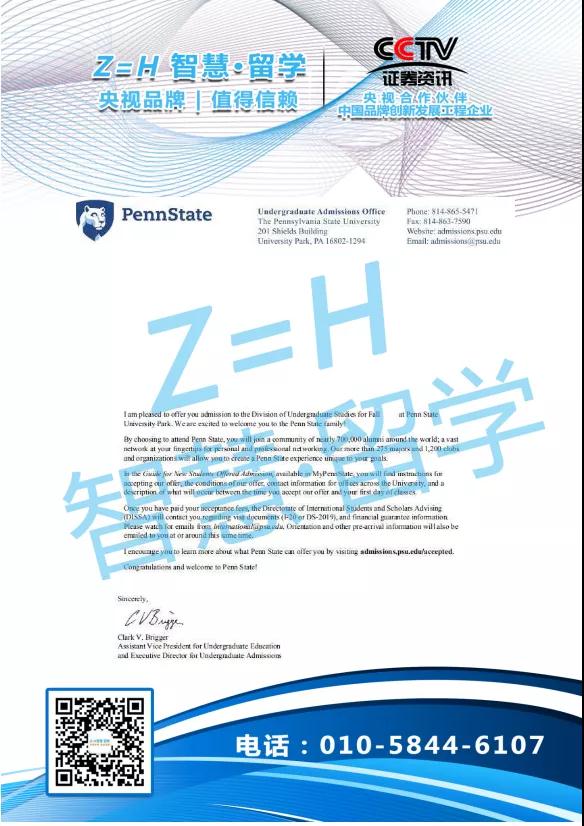 高端美国留学中介智慧留学—录取美国排名第50的宾州州立大学本科入学