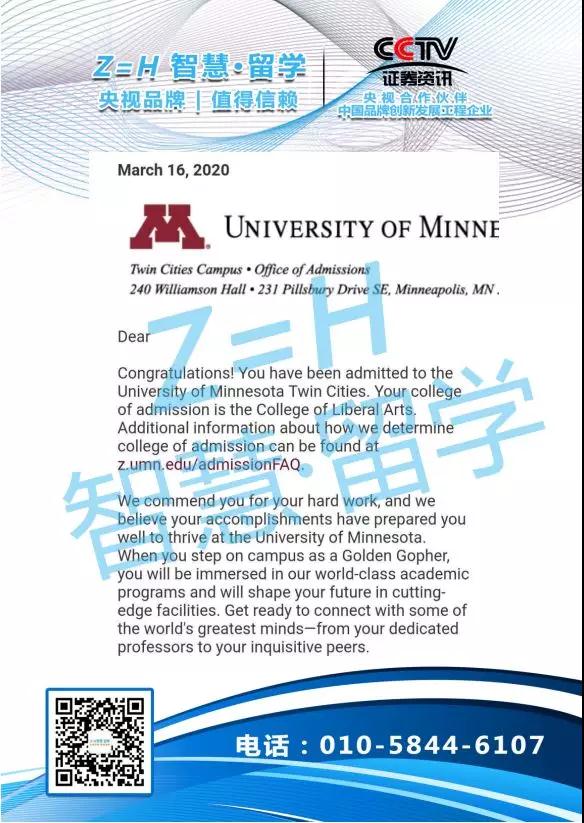 高端美国留学中介智慧留学—录取世界大学排名第35的美国明尼苏达大学本科入学