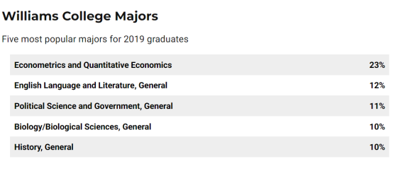 威廉姆斯学院有30余个提供本科学位的专业,在USNEWS上列出的前5个该校受欢迎的专业包括经济学、英语语言文学、政治学、生物、历史。此外,该校的强势专业还包括:数学、计算机、心理学、化学、艺术等。