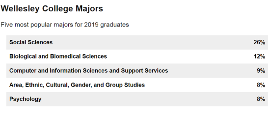 USNEWS上公布的韦尔斯利学院受欢迎的专业前5名是社会科学、生物、计算机及信息、文化种族研究、心理学。