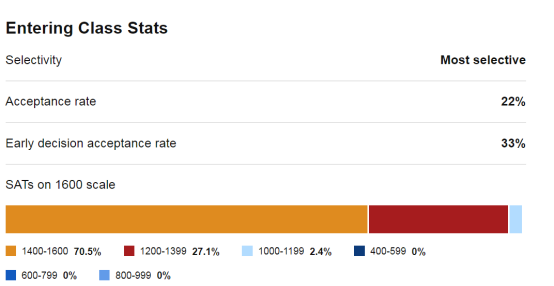 韦尔斯利学院录取要求非常严格,目前录取率是22%,ED录取率可以达到33%,往年录取的学生SAT成绩在1400-1600达到70.5%。学校只招收女生。